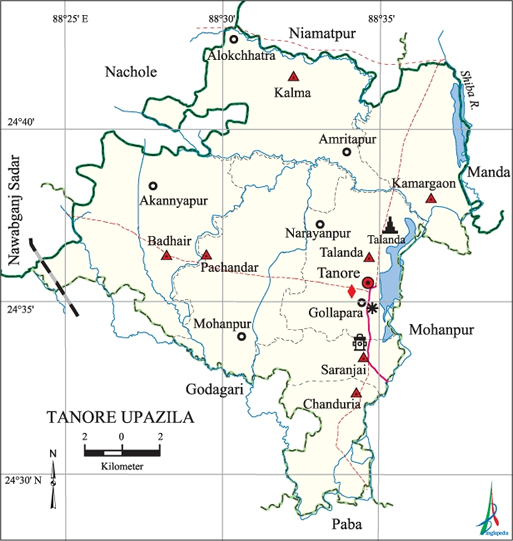 রেলগেট বাসস্ট্যান্ড→ তানোর উপজেলা থানা গেট → ভ্যান যোগে